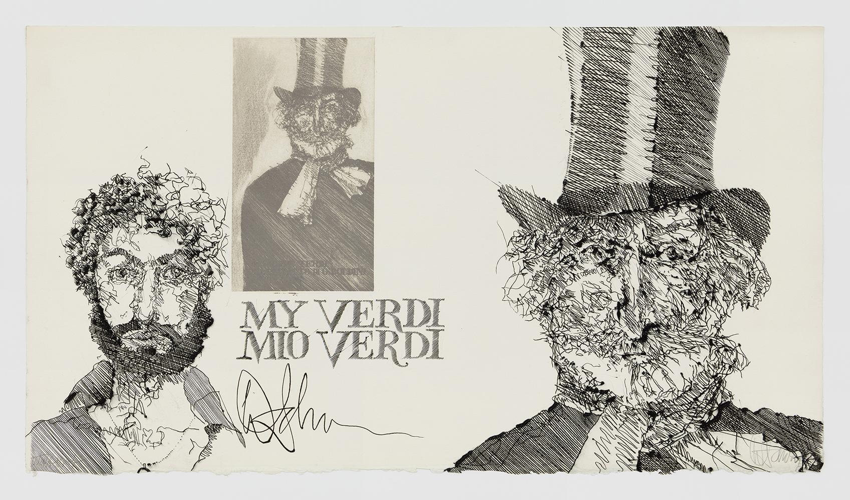 Schorr’s My Verdi (1979-1980) translated his obsessive love of opera into a series of prints depicting twelve Verdi operas. Schorr had a deep appreciation for the history of printmaking and drawing, and incorporated historic and rarely used techniques into his practice, such as silverpoint, engraving, and chine collé. These prints are his homage to the great Italian composer Giuseppe Verdi (1813-1901) and include details that opera lovers will appreciate. For example, in La Traviata, Schorr inventively uses Verdi’s lyrics to form Alfredo’s shadow and Violetta’s dress in their famous duet. My Verdi is being shown at Mary Ryan Gallery for the first time since it was created 45 years ago.
