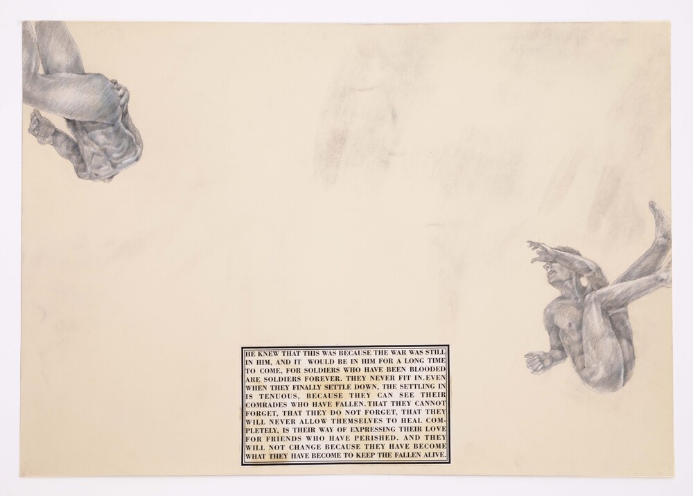 One work on view is from Schorr’s Songs with a Dying Fall series, created as a lament for his many friends whose lives were cut short by AIDS. Like much of Schorr’s work, this drawing incorporates text, here from Mark Helprin’s novel A Soldier of the Great War. The beauty of their bodies is at odds with the elegiac mood of the words. The phrase “dying fall” comes from Shakespeare’s Twelfth Night, and refers to a descrescendo.