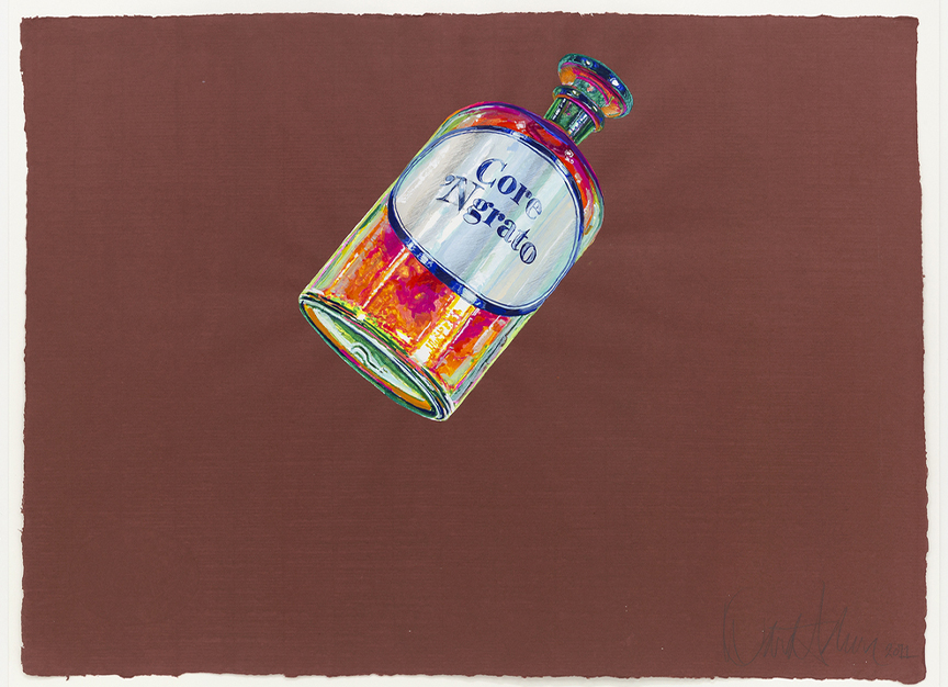 Also on view are gouache paintings from the artist’s Apothecary series, depicting antique apothecary bottles with imagined contents – in this selection, references to abstract musical concepts. Schorr was a fan of classical music and opera as well as Broadway tunes and pop music – Nowadays references a song from the musical Chicago. Meticulously executed in gouache and silverpoint on luxurious, colored Fabriano Roma papers, these paintings reveal bottles floating mysteriously, oblivious to gravity. Phyllis Rose wrote, “Sometimes I find myself thinking that the bottles of Apothecary represent nothing so orderly as an emotional inventory; they are at the same time the flotsam and jetsam of a very cultivated, poetry-loving, opera-loving, and music-loving mind.”