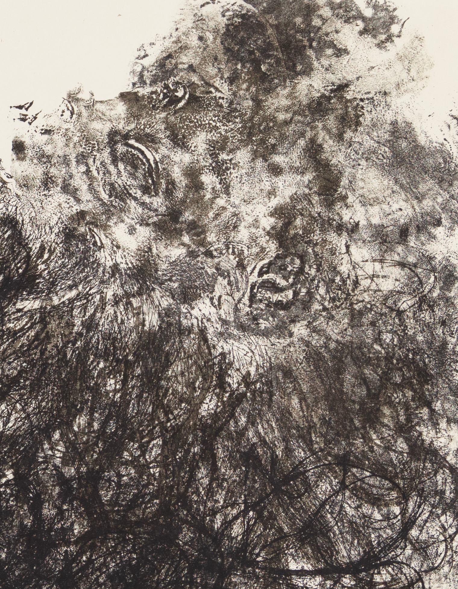 Untitled (Hair) is Smith’s first lithograph. Produced in 1990, this print uses imprints of the artist’s own hair, face, neck, and even a “Cher” wig, to create an almost-abstract composition infused with motion and dynamism. One of the first prints in which Smith used her own body as a part of the printmaking process, Untitled (Hair) demonstrates her inventive approach when tackling themes of the human body, natural world, and personhood. Both Kiki Smith 1993 and Untitled (Hair) are unexpected approaches to self portraiture, expanding what the genre can encompass.