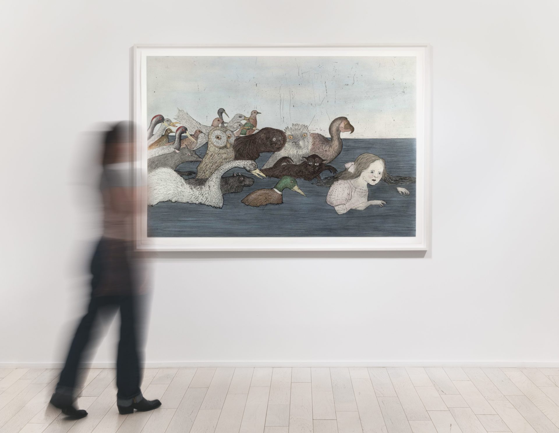 For the massive print Pool of Tears 2, Smith was inspired by Lewis Carroll’s drawings for his own manuscript Alice’s Adventures Under Ground (the published book contained illustrations by Sir John Tenniel), as well as encyclopedia images of animals and birds. In this scene from the book, Alice has been shrunken down and has fallen into a pool of her own tears. Smith used the largest etching plate that the studio, Universal Limited Art Editions (ULAE), could accommodate – in fact, the plate was so large that she sometimes had to sit on it as she worked.
